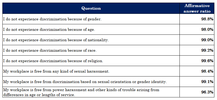 DISCO's fundamental way of thinking about diversity is stipulated in DISCO VALUES Management Guidelines, and states that "DISCO does not discriminate or evaluate employees based on personal attributes such as biological sex, sexual orientation, gender identity, age, nationality, race, religion, or educational background." The original statement established in 2002, "When evaluating an employee, DISCO does not consider personal attributions such as gender, age, nationality, race, religion or educational background," was later revised in 2022 in accordance with the changing society and necessity to do so. In addition, one of the ideal states that DISCO wishes to achieve by 2030 is "To have a corporate culture in which diversity is mutually recognized and incorporated" as stipulated in DISCO VISION 2030. In order to achieve this state, the company has set a tracking index of "100% attendance in company education seminars regarding diversity," and it is mandatory for all employees of the DISCO Group (full-time employees, specified-task employees, dispatch employees, incoming transfer employees, etc.) to take a diversity education seminar once a year. The Employee Satisfaction (ES) survey also has multiple questions regarding diversity, such as whether the employee is experiencing discrimination because of gender, age, nationality, race, religion, sexual orientation, gender identity, etc., and these are answered using a 1-to-5 rating scale, upon which the total results are reported to the ES Committee made up of Executive Officers.