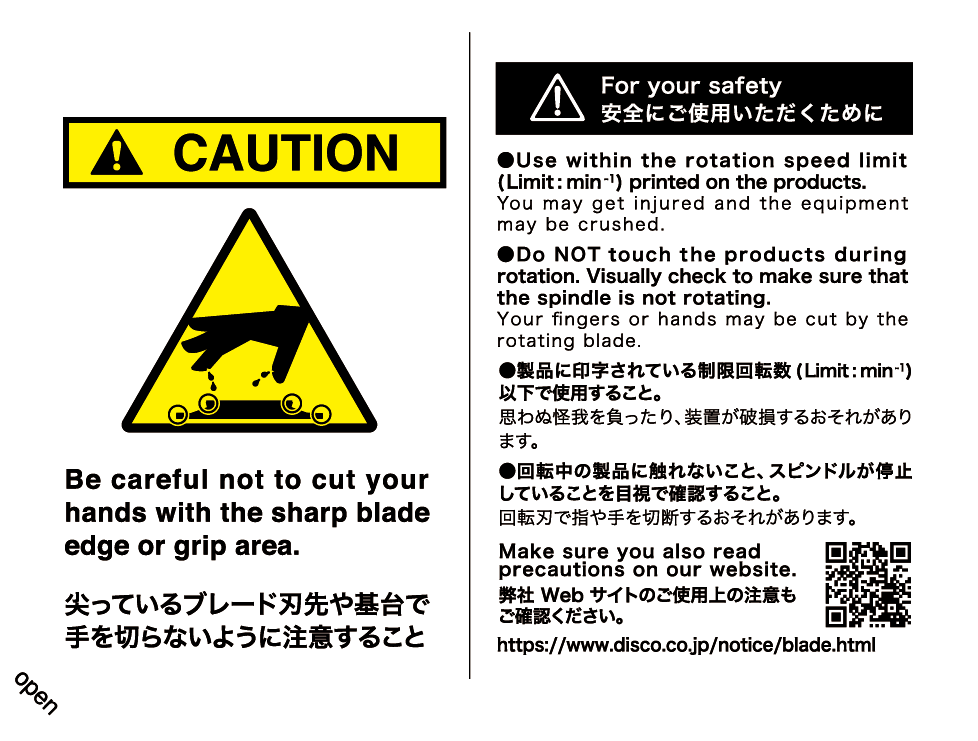ブレード、ホイール(以下、精密加工ツール)は、装置セットアップ時のアイドリング(空回し)において過度に高速回転させた場合、破損して人体や装置を傷つける可能性があります。こうしたトラブルを未然に防ぐため、精密加工ツールに印字された「制限回転数※」を必ず守ってください。
